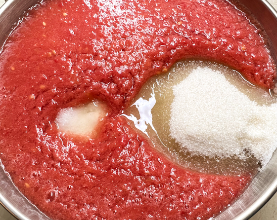 Помидоры измельчить блендером. Добавить в пюре соль, сахар и перемешать.