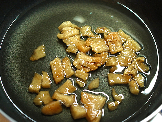 Сало (около 100 г) нарезать на произвольные кубики, сложить в сотейник с дном потолще и поставить томиться на самый маленький огонь, накрыв крышкой. На это уйдет примерно 25-30 минут. Осторожно, крышку не открывать, жир может выстрелить! Когда шкварки станут золотистыми, снять сотейник с плиты и дать остыть. Только потом снять крышку и процедить жир. Шкварки выбросить.