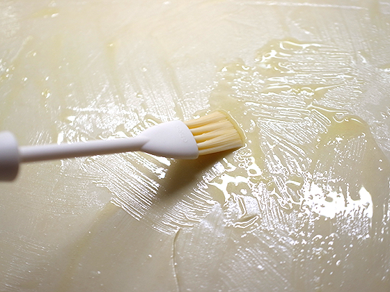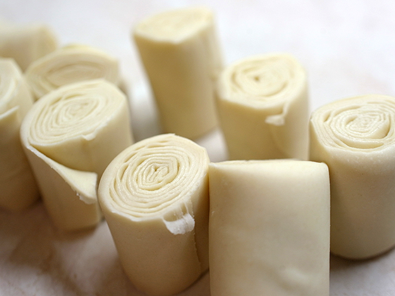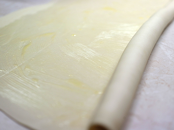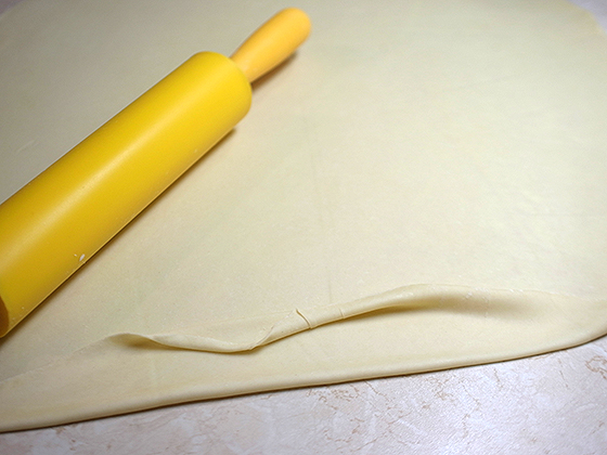Присыпать рабочую поверхность крахмалом и раскатать тесто в прямоугольник максимально тонко. Тесто эластичное, хорошо и ровно раскатывается, ни к чему не липнет.