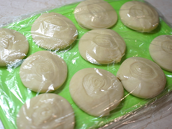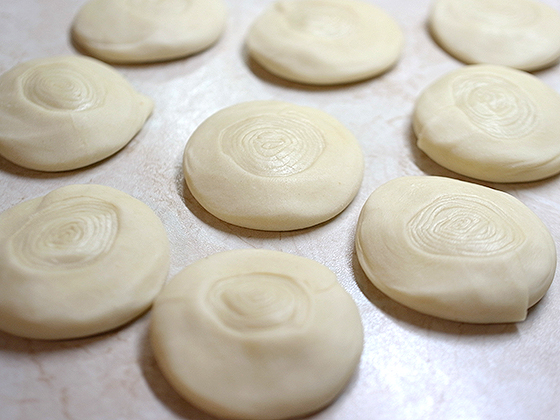 Каждый кусочек поставить на торец и прижать ладонью, придавая форму лепешки.