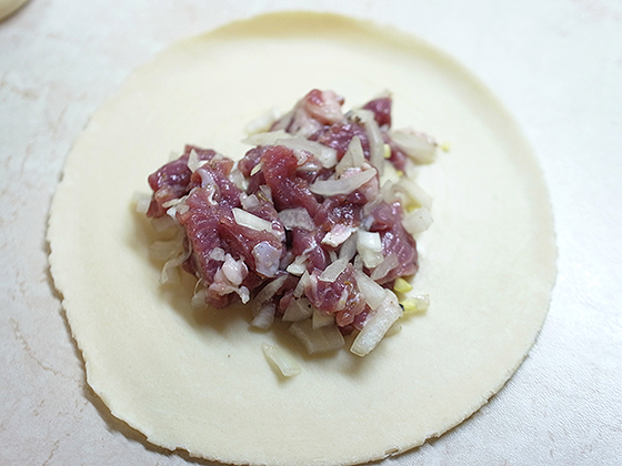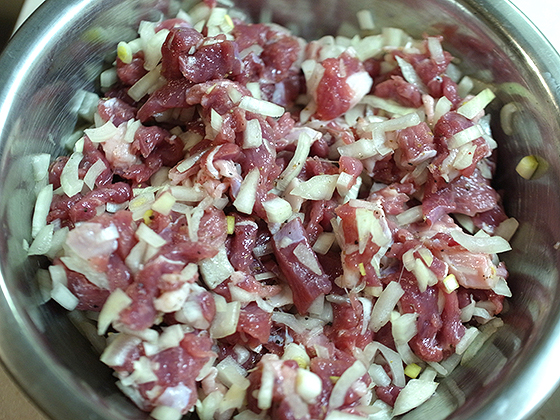 За это время мелко нарубить ножом мякоть баранины (примерно 400 грамм) и две крупные луковицы. Посолить, поперчить, посыпать зирой и перемешать.