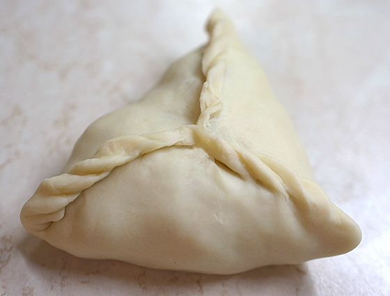 Защипить края самсы, придавая форму трегольника. Защипывать как можно плотнее, закрепить косичкой, чтобы не вытек сок.