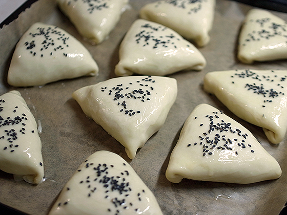 Выложить самсу швом вниз на застеленный пергаментом противень, смазать взбитым яйцом и посыпать кунжутом.