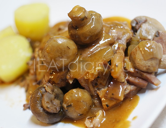 Заменитый петух в вине, очень вкусное национальное блюдо французкой кухни, которое имеет столько же вариантов приготовления, сколько провинций во Франции. По традиции, Coq au vin готовят именно из мужской особи семейства куриных, но, ясное дело, в наших широтах свободно купить можно только женскую, что, я думаю, не так принципиально для вкуса блюда.