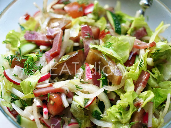 Хрустящий салат с летними овощами и пикантной копченой ноткой. Хорошо идет вместо ужина - легко, сытно и вкусно.