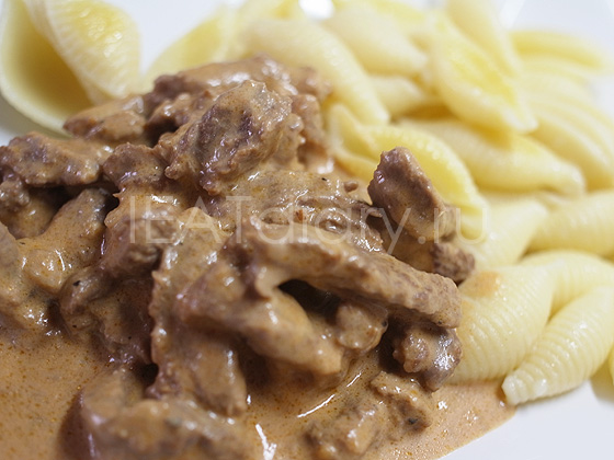 От фрнцузского Bœuf Stroganoff, то есть говядина по-строгановски. Не смотря на то, что блюдо не является национальным, оно относится к русской кухне и до сих пор очень популярно в нашей стране, во всех заведениях общепита и в домашней кулинарии. Приготовление - простейшее, хорошо сочетается практически с любым гарниром и всем знакомый вкус еще с детского сада.