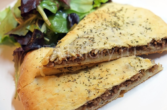 По-моему, в какой-то среднеазиатской кухне есть похожее блюдо. А возможно, эта лепешка по мотивам закрытой пиццы.. В любом случае - у меня получилась простая вариация мясного пирога. Замечательный ужин, когда не хватает времени на то, чтобы проводить его на кухне.