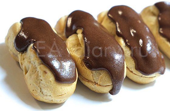 Эти изысканные французские пирожные были изобретены в ХIХ веке, и являются потомками профитролей. В отличие от своих предшественников, éclair всегда делают только со сладкой начинкой. Эклеры быстро завоевали весь мир, и в советскую эпоху это было самое распространенное у нас пирожное, которое всегда можно было купить в любой кондитерской. Мои сегодняшние эклеры с шоколадным кремом и шоколадной глазурью (лето закончилось, прощай талия, ура - пирожным!))